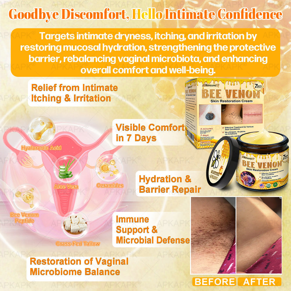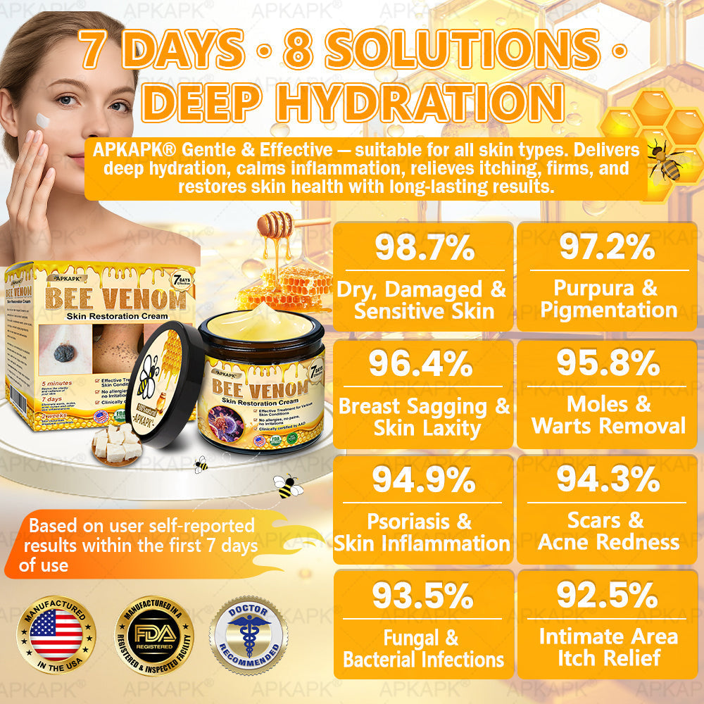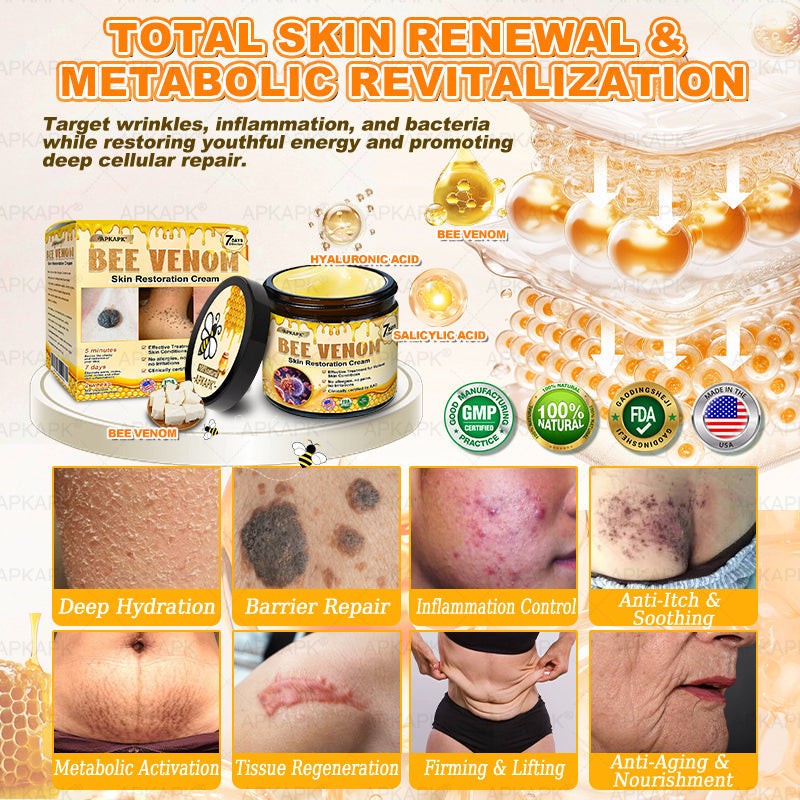 In response, APKAPK® Bee venom Skin Restoration Cream was scientifically developed under rigorous standards. Its formula combines the restorative power of natural bee venom and grass-fed tallow, synergized with hyaluronic acid, collagen, vitamin C, centella asiatica, and over ten other potent bioactive ingredients. Together, they deliver multi-dimensional care — from deep hydration and barrier repair to anti-inflammatory relief, itch control, metabolic renewal, tissue restoration, and anti-aging nourishment. Clinically validated and produced in GMP-certified facilities compliant with U.S. and EU safety standards, this cream offers a safe, effective, and drug-free multi-repair skincare solution for dryness, inflammation, irritation, and signs of aging — restoring comfort, resilience, and lasting skin health.